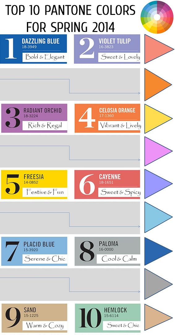 Happy Friday, color lovers! Remember a few days ago when I announced that Pantone had named Dazzling Blue their color for Spring of 2014? You know the post? The one where I gushed over what a spectacular shade of blue it was? Check it out here if you missed it. Well, today, my friends, I have another colorful treat for you. Not only did Pantone come out with the color for spring, they also announced the Top 10 Pantone Colors for Spring, 2014. So without further ado, let's dive into this lovely little list!