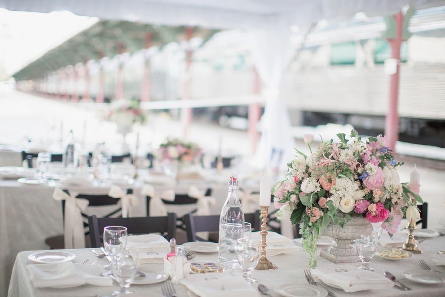 Photographer: Watson-Studios // Transportation: A Regal Carriage Company // Equipment Rentals: All Occasions Party Rentals // Hair Stylist: Bangs and Blush // Calligrapher: Feast Fine Art & Calligraphy // Invitation Designer: Fourth Year Studio // Event Designer: Jennifer Laraia Designs // Bakery: Sugarbuzz Custom Cakes // Linens and Coverings: Table Five Linens // Band: The Downtown Band // Event Venue: The Southern Railway Depot // Floral Designer: Whimsical Gatherings