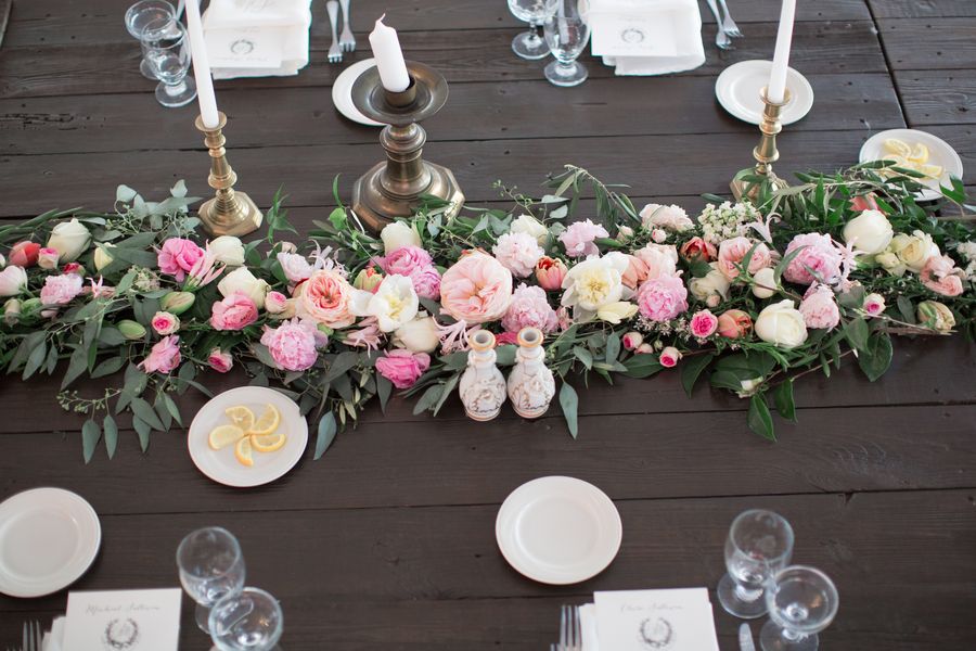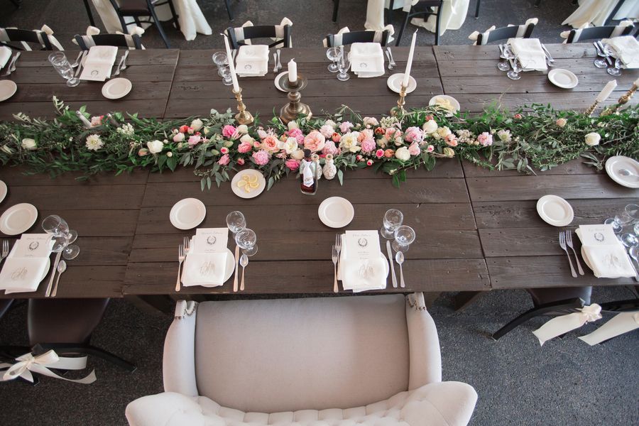 Michael and Claire had a calligrapher create their wedding monogram, which they used on everything from our invitations to napkins. From the farm style tables to the lace linens, every detail was carefully executed. I also love that cigars were stationed around the Depot on top of old whiskey barrels. Such a celebratory touch.