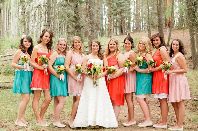 Bridesmaids: Photo by Jennefer Wilson via Green Wedding Shoes // Ring: ShopRuche // Centerpiece: Photo by Byron Lawn Fawn via Magnolia Rouge // Painted Mason jars: The Speckled Egg 2011 // Chevron Chairs: Color Chats // Place Settings: Photo by Haley Photography via Style Me Pretty // Bowties: the Belle and the Beau // Necklace: Dancing Blue Butterfly // Pretty Dessert Table // Photo by Gavin Farrington Photography via Lovely Little Details // Aqua Bridesmaid Dress: Kerry June // Centerpiece: Citrus and Orange // Floral Accents: Hapitat