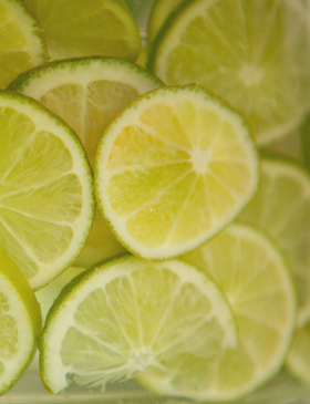 The centerpiece is easy to DIY. Simply place a small vase inside of a larger vase. Fill the space in between the vases with thin slices of limes. Pour water over the limes so that they float. Fill the smaller vase with water and add your flowers. Can't get easier than that!