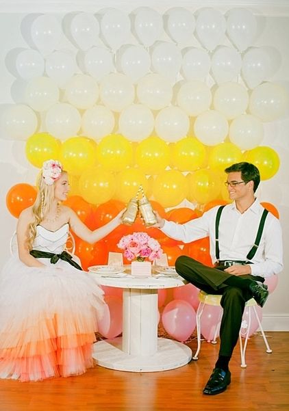 Invitations: Evermine // Ombre Aisle: Martha Stewart Weddings // Wedding Cake: // Favor Tags + Invitations: Evermine // Ombre Napkins: Alante Photography via Style Unveiled // Bottle Centerpiece: Photo by Rustic White Photography via Ruffled // Balloon Backdrop: Michelle March Photography via Bride and Joy // Cooking Labels: Evermine // Bridesmaid dresses by Donna Morgan, Trent Bailey Photography via Bridal Musings // Macaron Cake One Love Photo via Style Me Pretty // Ombre parfaits via Wedding Chicks // Place Cards: Love Wed Bless