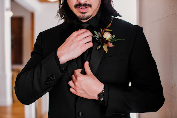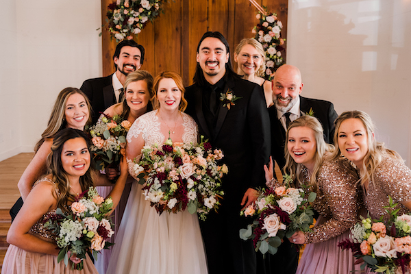 The color palette is pure perfection with hints of burgundy, soft sage, black, and peach. Be on the lookout for a twirl-worthy wedding dress by WToo by Watters, a super cool photo bus called the Haulin’ Nostalgia, and a beautifully modern wedding invitation suite. Oh, and the greenery tucked in the rafters? Gorgeous, gorgeous, gorgeous!