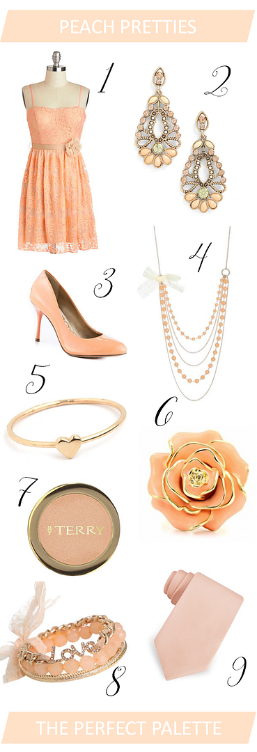 1. peach dress | modcloth 2. sweet chandeliers | modcloth 3. heels | sam edelman 4. necklace | wet seal 5. heart ring | anthropologie 6. flower ring | fantasy jewelry box 7. peach eye shadow by terry | beauty.com 8. love bracelet | wet seal 9. peach tie | ties}
