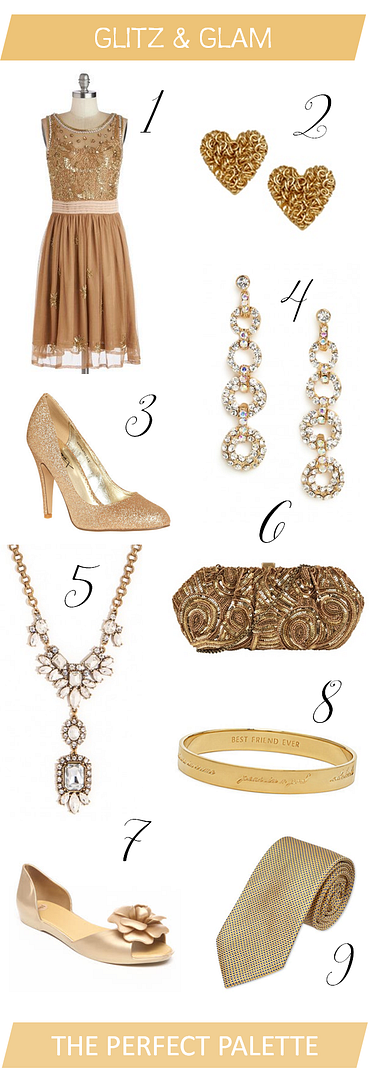 1. gold dress | modcloth 2. heart studs | asos 3. glittery gold heels | modcloth 4. chandelier earrings | baublebar 5. art deco inspired necklace | baublebar 6. gold clutch | pink mascara 7. flower flats | dr. jays 8. 'best friend ever' bangle | kate spade 9. goldent tie | charles tyrwhitt}