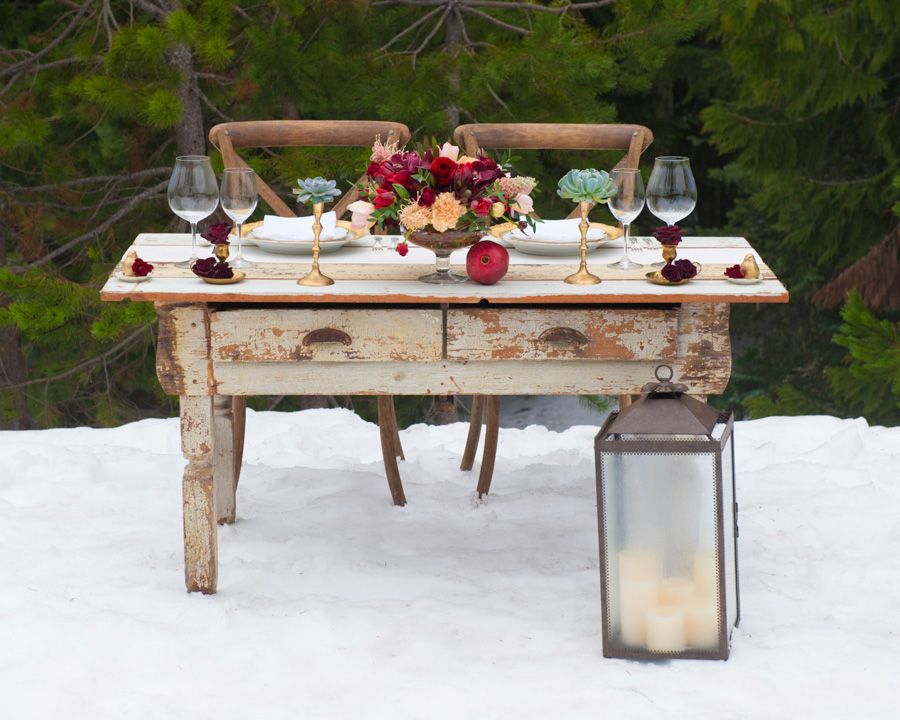 Amazing details to be on the lookout for: petite clementine and raspberry cheesecakes dusted with pomegranate seeds, golden candelabras topped with succulents, a distressed farm table surrounded by fresh powdery snow, golden antique china, and these stunning organic floral arrangements that were locally grown.