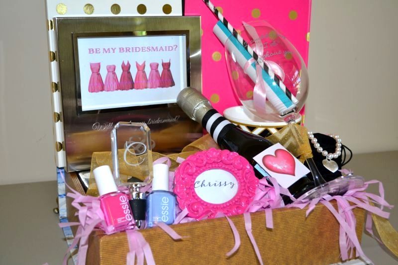 So here's what you'll need: A gift box, some ribbon, a couple of nail polishes, a card, a few personalized keepsakes, a mini wine bottle and a wine glass.