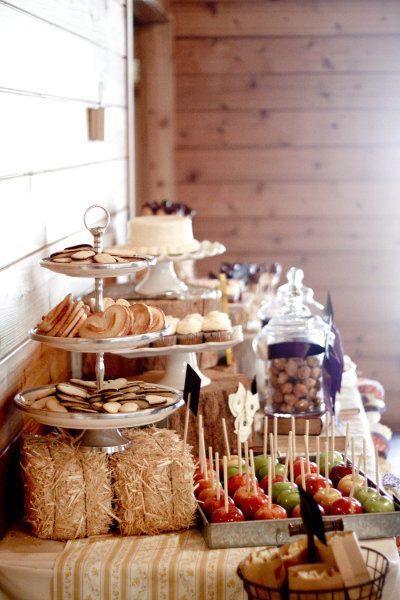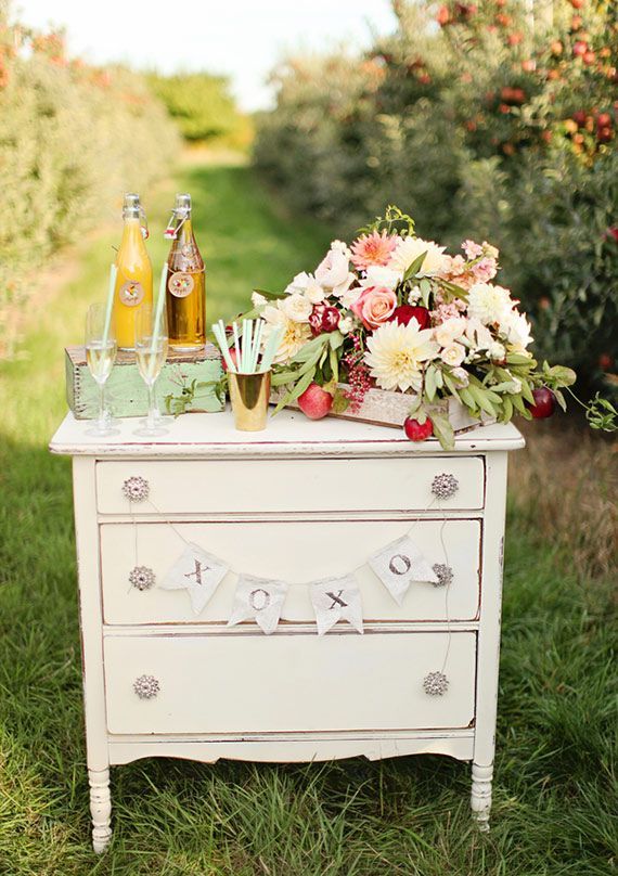 Cider: Mallory Morgan Photography via Style Me Pretty // Bouquet: O'Malley Photographers via Style Me Pretty // Burlap Bags: // Apple Slices: // Dessert Bar: B Schwartz Photography via Style Me Pretty // Gown: // Floating Votives: Dreamy Whites via B. Lovely Events // Display: Sarah Park Events photo by Nessa K Photography florals by Petal and Print via Ruffled // Bouquet + Drink Station: Michaela Noelle Design photo by Ashley Slater Photography via 100 Layer Cake // Sign: Landon Jacob Photography via Style Me Pretty // Caramel Apples: via Camille Styles Party Invite: Rebecca Hansen Photography via Style Me Pretty