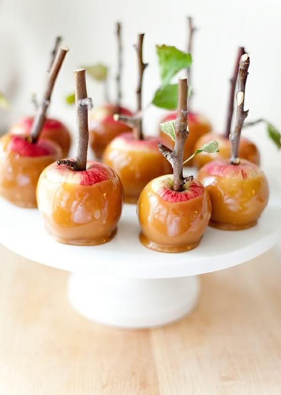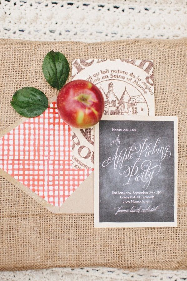 From apple cider donuts to a bobbing station, as you can see there really is no shortage of cute ideas. I also am so in love with the idea of an apple picking party! How cute are those kraft envelopes with the red and white gingham liners? And the chalkboard inspired invitations? So super cute with a theme like this. Oh, and I can't go without mentioning those caramel covered apples on little branches by Camille Styles. Such a cute idea and definitely steal-worthy!