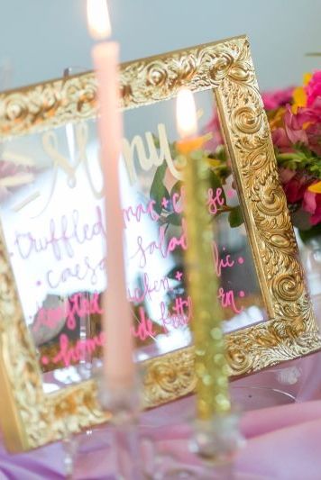 From the designer, "Placed center stage is a hanging gold frame and acrylic insert written with their love story and adorned with beautiful gold garland, tissue and gold foil paper flowers. Each place setting has a custom acrylic place card with fun calligraphy bringing the radiant orchid and pink colors to each setting. An acrylic and gold frame was placed on the table letting all the guests know what's on the menu for dinner."