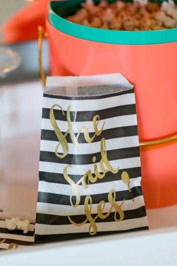 "Hand dyed coral napkins with ball fringe make the setting inviting and add a fun element. For dessert, homemade kettle corn was on the menu! A custom sign stating"he 'popped' the question" and hand written favor bags said "she said yes!" is a fun play on words to a simple dessert and brings in the engagement theme. Set on a crisp white and gold tray table, this popcorn dessert station is the perfect ending to a small gathering!"